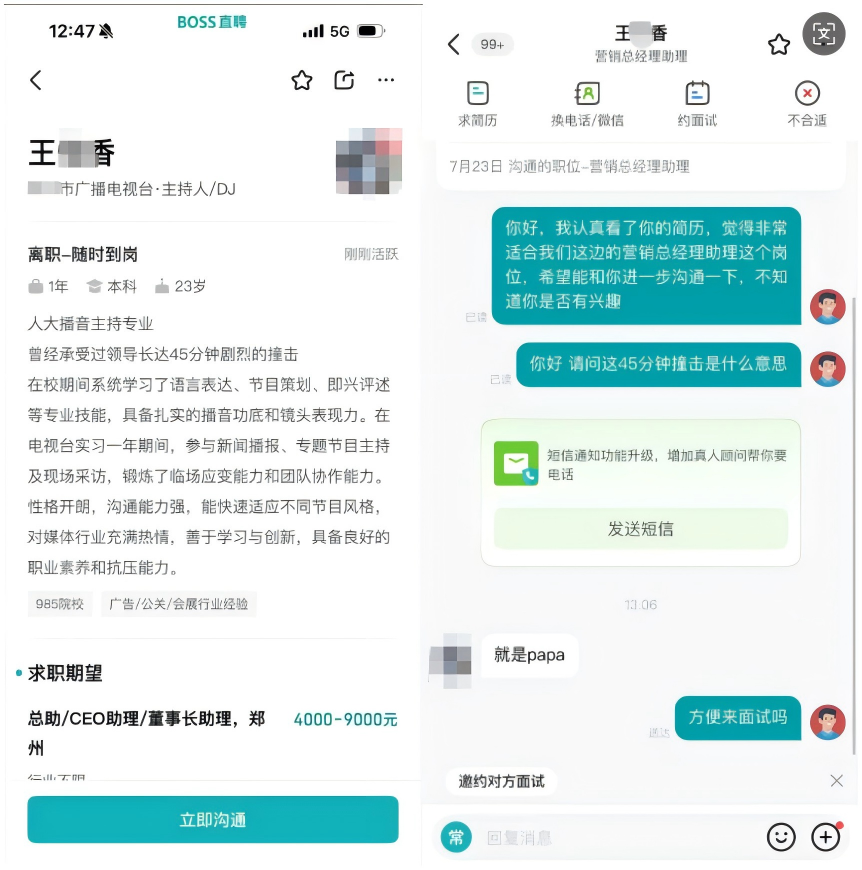 7月23日,有网友在社交平台发布截图称,在BOSS直聘平台上,一位名叫“王某香”的求职者,在简历中写有“曾承受领导长达45分钟剧烈撞击”等露骨表述,引发“色情招聘”质疑。