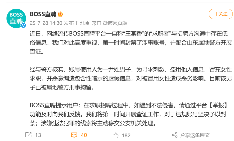 7月28日,BOSS直聘发布声明称,经警方调查,账号使用人为一尹姓男子,为寻求刺激,盗用他人信息,冒充女性求职,并恶意编造包含性暗示的虚假信息,对被冒用女性造成恶劣影响。目前该男子已被属地警方刑事拘留。