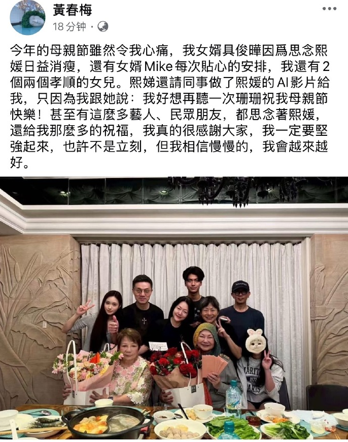 据此前报道,S妈在今年母亲节贴出一家团聚的照片,向粉丝表达感谢,强调自己会慢慢好起来,她也透露:“我女婿具俊晔因为思念熙媛日益消瘦。”