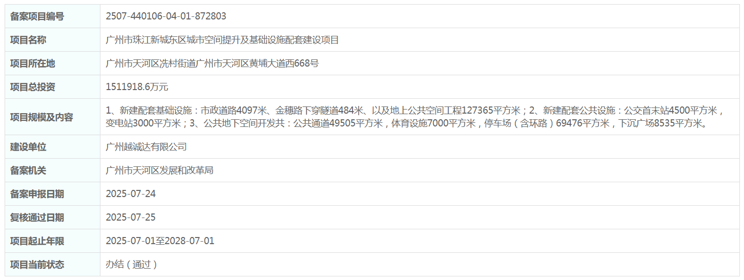 该项目位于天河区冼村街道黄埔大道西668号,总投资额高达151亿元,由广州越秀集团旗下越诚达有限公司负责一级开发。根据备案信息,项目将于2025年7月启动,计划2028年7月完工。