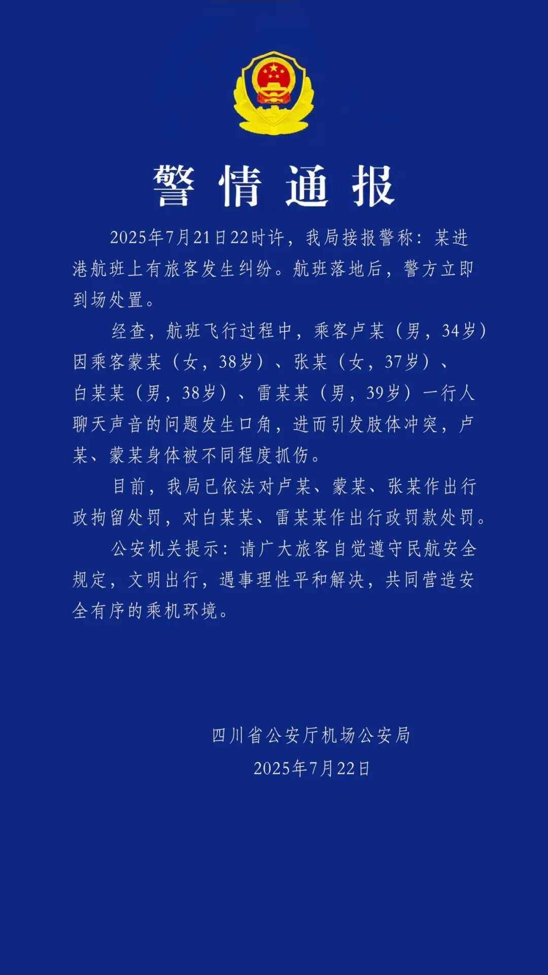7月22日晚,四川省公安厅机场公安局发布警情通报: