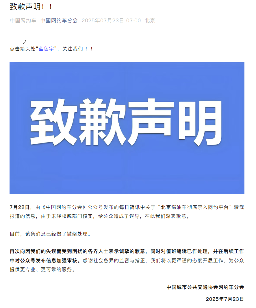 7月23日,中国城市公共交通协会网约车分会就昨日发布“北京燃油车彻底禁入网约平台”简讯致歉。