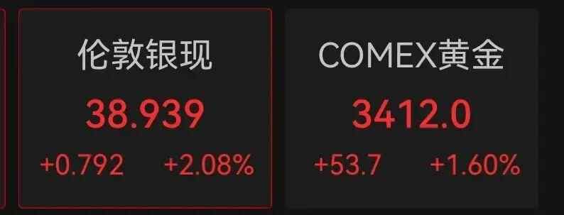 此外,COMEX期货黄金涨1.6%,报3412美元/盎司。现货白银涨幅也扩大至2%,报38.939美元/盎司。