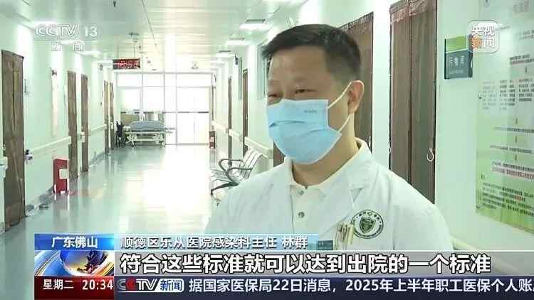 顺德区乐从医院感染科主任 林群:目前我们判断出院的标准,一是病人已经症状明显好转了或者是消失了,第二个是他的住院时间,也就是病程超过5天,并且我们给他做一个核酸检测,它是一个阴性的结果,符合这些标准就可以达到出院的一个标准。