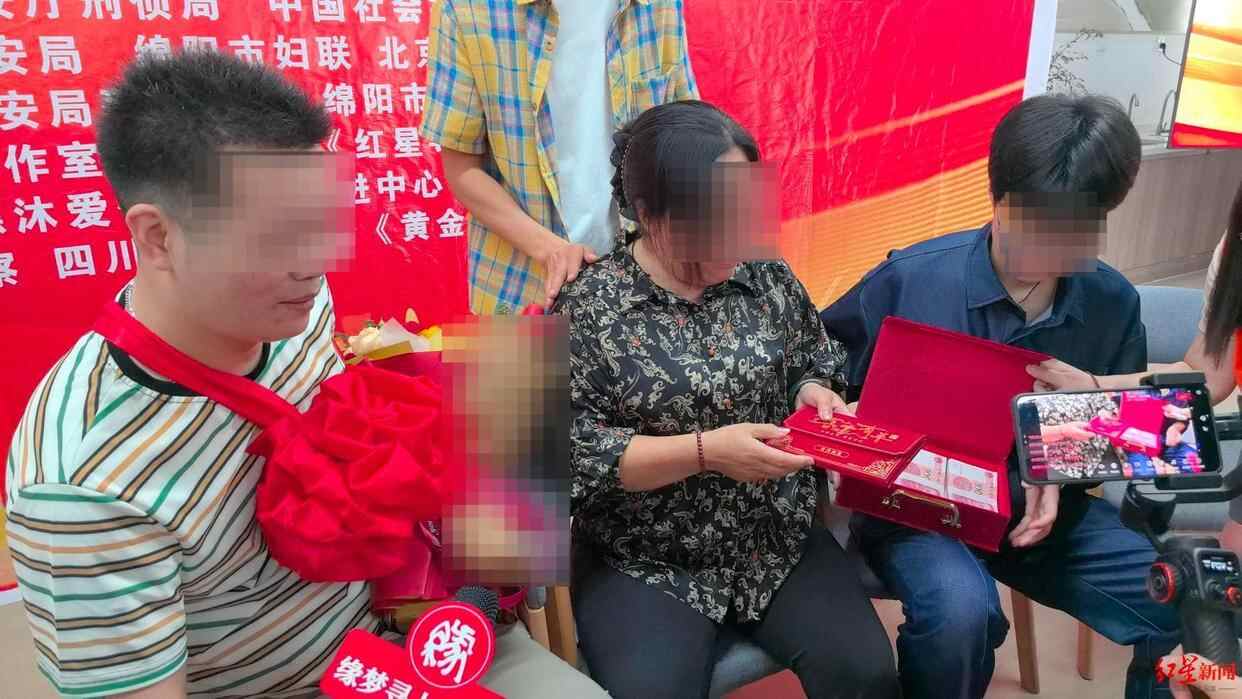 平复心情后,张英给儿子戴上大红花,送上了一束鲜花。随后,她拿出一个精美包装的盒子,将自己存的6万元现金给了儿子,“妈妈对不起你,只能尽能力弥补。”