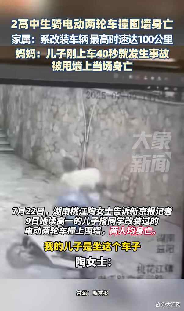 2025年7月9日14时,湖南益阳桃江县两名中学生(高一学生)骑非法改装电动两轮车超速行驶,因刹车失灵撞上路边墙体,两人均身亡。两人均未佩戴安全头盔。