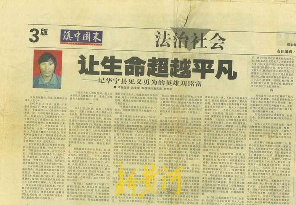 2003年5月24日,云南当地媒体曾在报纸发表题为《让生命超越平凡——记华宁县见义勇为的英雄刘铭富》一文。文中称,刘铭富平素在村里就以好打抱不平、爱管闲事著称。每当村里有家庭在闹矛盾,都少不了他去调解,为了村里的安宁,他也乐意去做这方面的事,及时化解了许多家庭矛盾。由于其为人正直,乐于助人,遇事不推诿,赢得村民们的信任,被大家选为村民小组副组长。