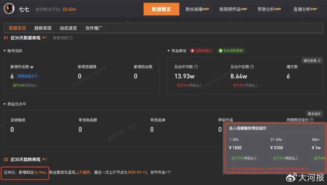 第三方数据显示,“七七”视频平台账号近30日涨粉14.74万。此外,该账号1S-20S视频预估报价为1500元,21S-60S视频预估报价为3100元,60S+视频预估报价为1万元。
