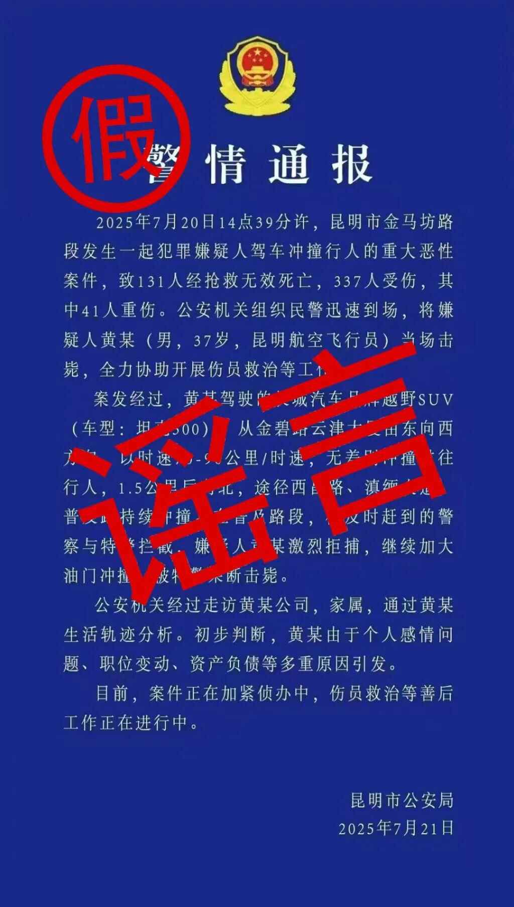 昆明市公安局五华分局7月23日中午通报:近日,有网民在互联网上传播虚假“警情通报”,造谣传播在昆明发生一起致多人死伤的重大恶性案件等不实信息,引发大量网民讨论。公安机关迅速核查处置。