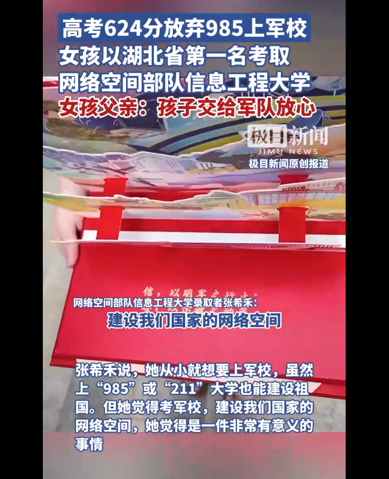 湖北一高考624分女孩放弃985上军校,父亲发声:孩子交给军队放心