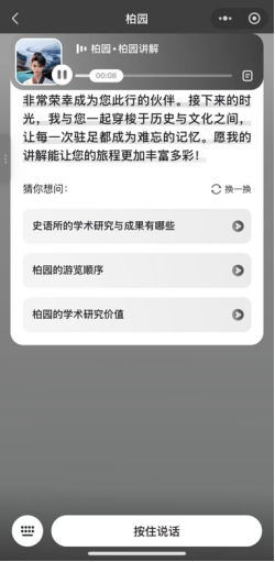 此次上线的数智柏园系统依托百度文心一言大模型,构建了柏园专属RAG知识库,整合了历史文献、考古成果、建筑档案等核心资料。游客只需打开微信小程序,即可享受“数字人标准语音讲解+AI深度交互”服务。