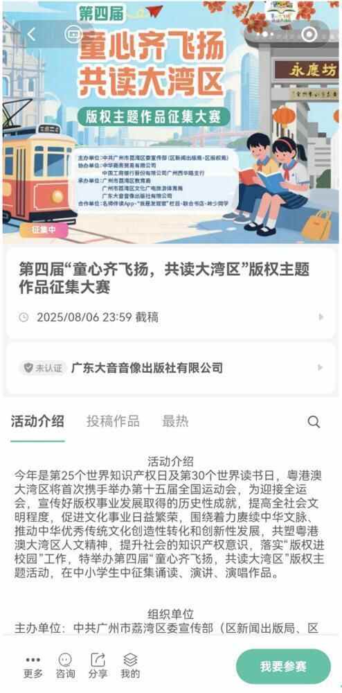 7月23日,羊城晚报记者从广州市荔湾区获悉,第四届“童心齐飞扬,共读大湾区”版权主题作品征集大赛已启动。