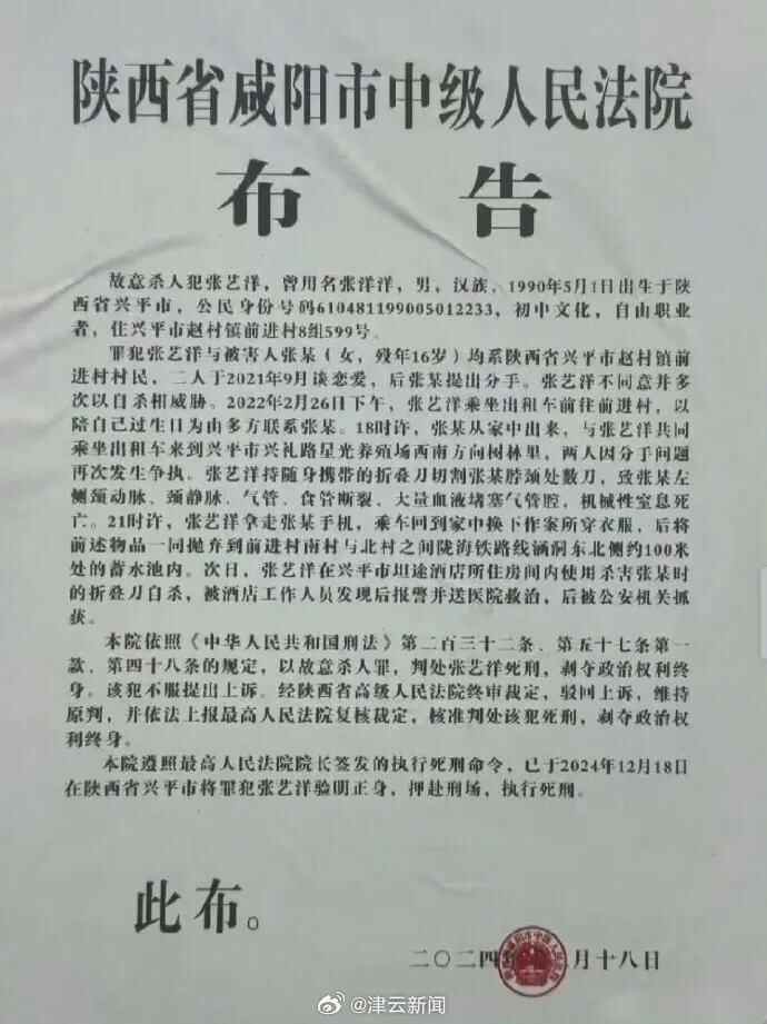 陕西咸阳市中级人民法院近日公布一宗曾轰动社会的杀人案调查报告,2022年时,男艺人张艺洋因不满16岁女友提出分手,持刀将其杀害,并试图制造女方自杀假象,最终以故意杀人罪被判处死刑,并已于去年12月18日被执行死刑,他也因此成为中国娱乐圈首位被依法判处并执行死刑的艺人。