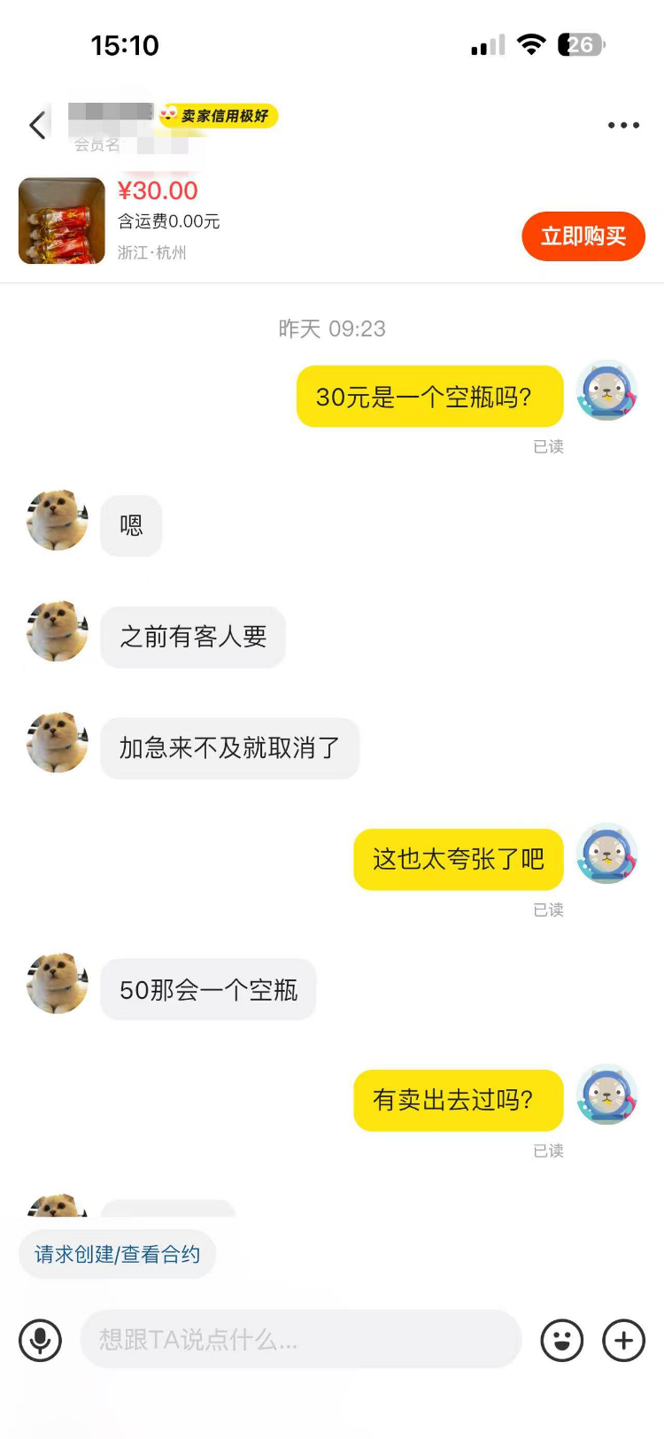 7月22日上午,记者通过平台私信该卖家,询问“20箱卖了没有”。记者很快收到该卖家设置的自动回复“我现在不在线,商品还在,直接拍。”当天下午15:21,记者试图再次联系该卖家,却发现已无法对话,平台提示:“由于对方设置,你无法与ta对话。”