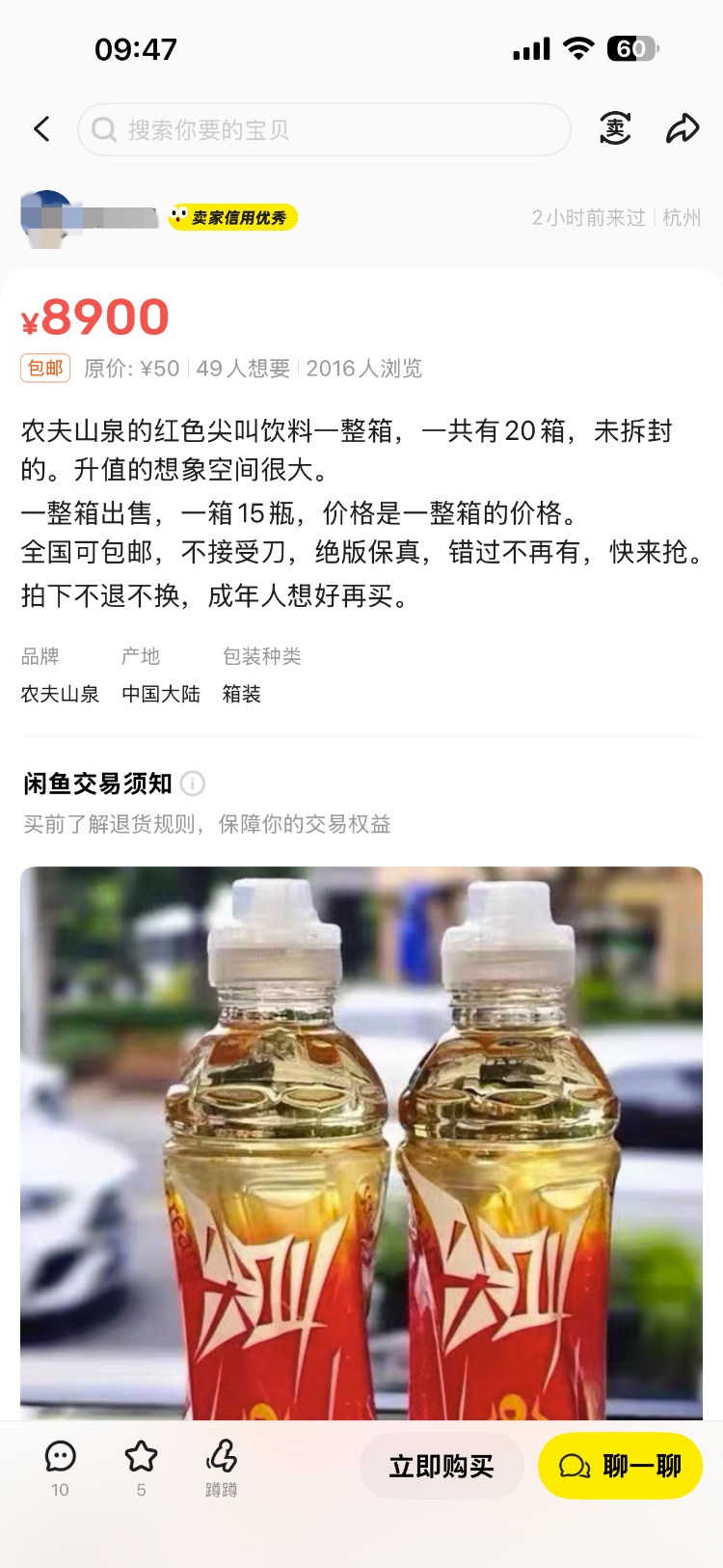 在某二手平台上,记者找到了标价8900元一箱(15瓶)的卖家,对方称:“农夫山泉的红色‘尖叫’饮料一共有20箱,未拆封,升值想象空间很大。一整箱出售,一箱15瓶。全国可包邮,不接受刀(记者注:大幅砍价),绝版保真,错过不再有,快来抢拍不退不换。”