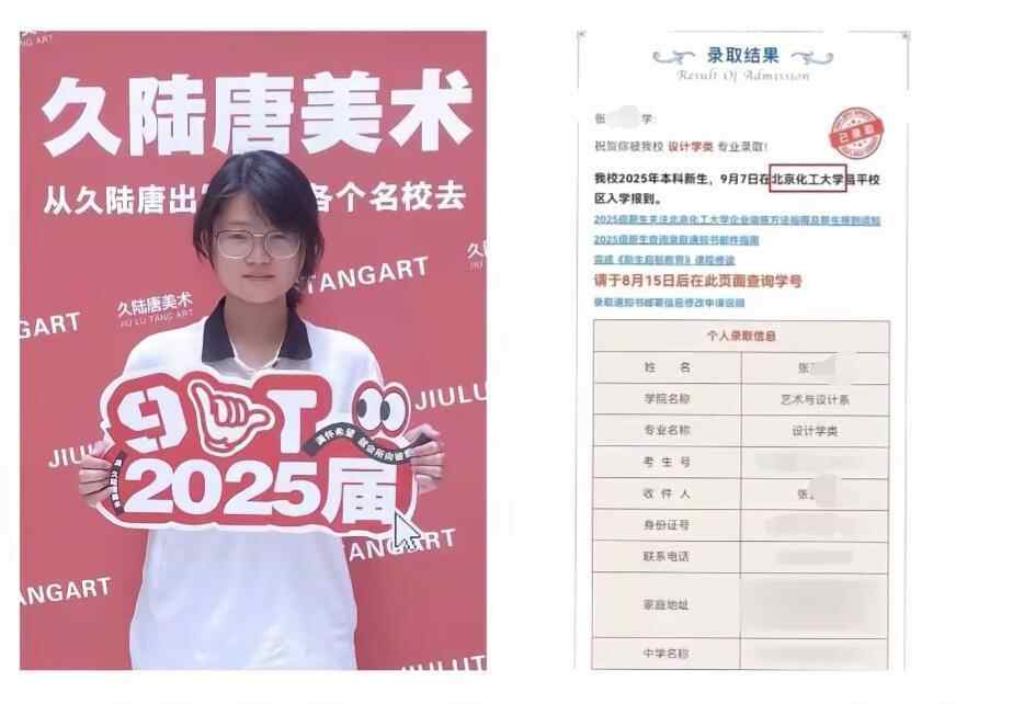 该网友发文称,今年参加河北高考的女儿张同学,已被北京化工大学艺术与设计系的设计学类本科专业录取,9月7日将前往学校的昌平校区入学报到。