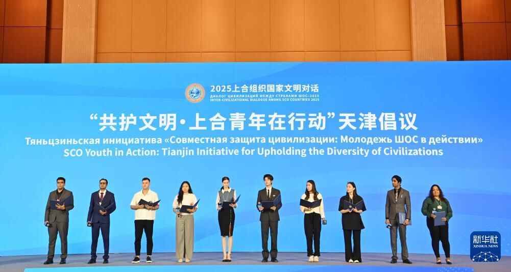 7月23日在2025上合组织国家文明对话现场拍摄的“共护文明·上合青年在行动”天津倡议发布环节。新华社记者 李然 摄