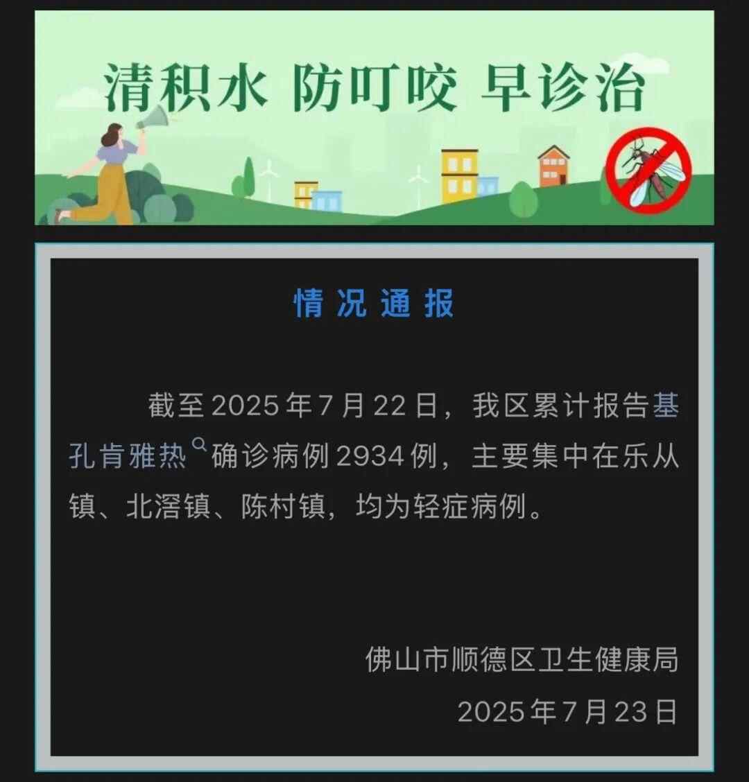 7月23日下午,广东佛山市顺德区卫健局发布情况通报,截至2025年7月22日,我区累计报告基孔肯雅热确诊病例2934例,主要集中在乐从镇、北滘镇、陈村镇,均为轻症病例。