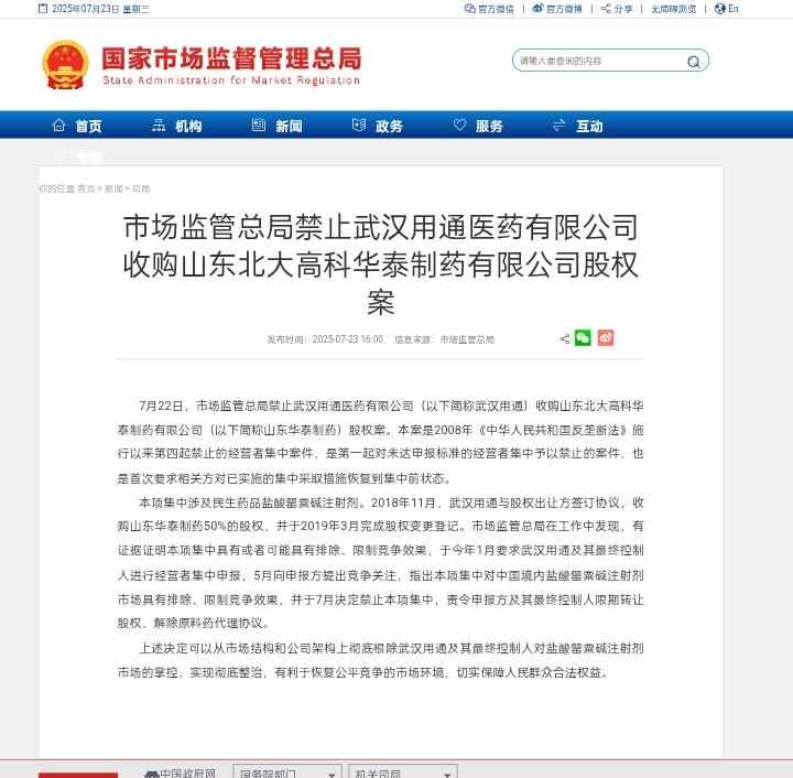 老话说,宁拆十座庙不拆一桩婚。如果一场企业联姻损害了百姓利益,不仅要拆还要拆彻底。7月23日,市场监管总局罕见叫停了一起已完成6年多的医药企业并购案。并购双方为武汉用通医药有限公司(以下简称“武汉用通”)和山东北大高科华泰制药有限公司(以下简称“山东华泰制药”),牵涉常用药品盐酸罂粟碱。