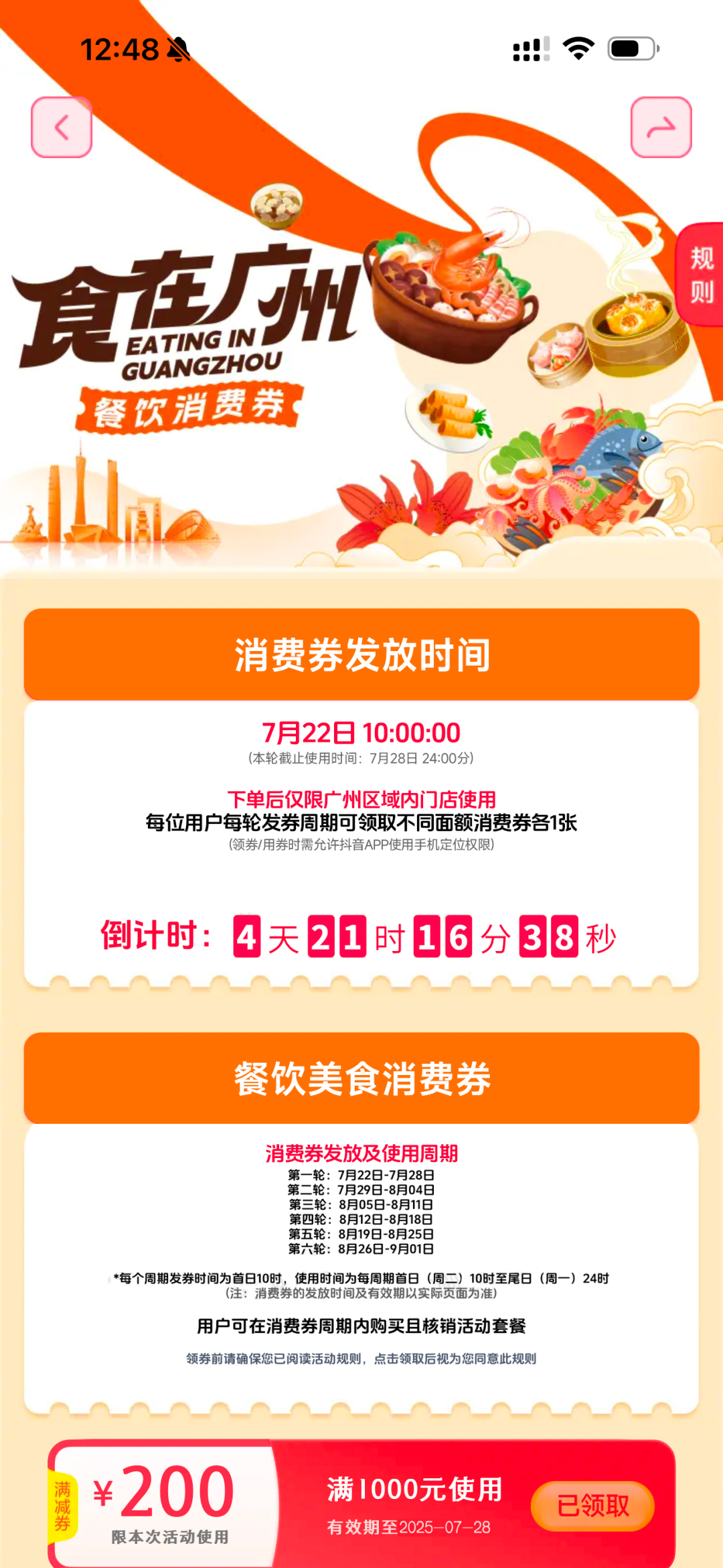 4.每个领券周期内,在每个活动平台,每名符合定位要求的消费者可领取每类消费券各一张。消费券名额有限,先到先得,领完即止。