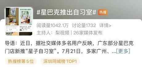 7月22日,“星巴克推出自习室”登上热搜,据透露,广东部分星巴克门店新推“星子自习室”,多家广州、深圳地区星巴克门店店员确认星巴克新推出“自习室”供客户学习。