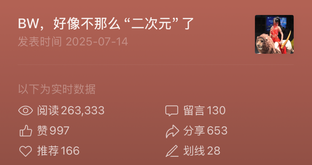前不久参加BW,游戏日报做出了多篇爆款。微信公众号上,针对BW展会变化的深度探讨文章阅读量超25万,聚焦二重螺旋展台亮点文章阅读量超6万;小黑盒上,采访明末制作人和分析腾讯规模参展动机的文章阅读量均超5万……