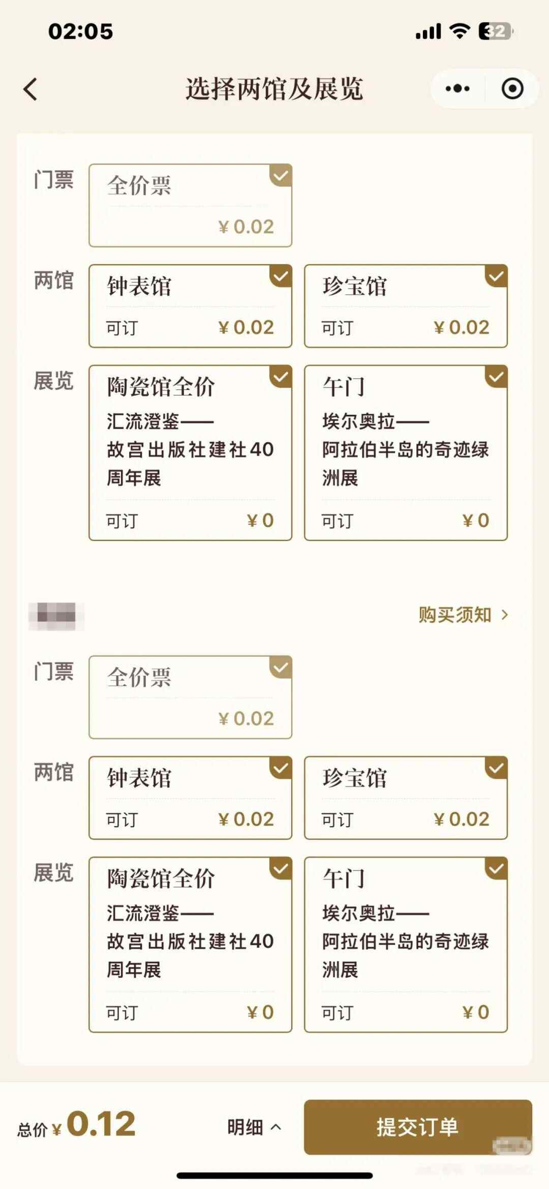7月22日凌晨,不少游客“薅”到了故宫博物院的羊毛。从购票系统进入后,游客发现,故宫博物院的全价门票才0.02元,钟表馆、珍宝馆的票价也都是0.02元,相关展览的票价则是0元。
