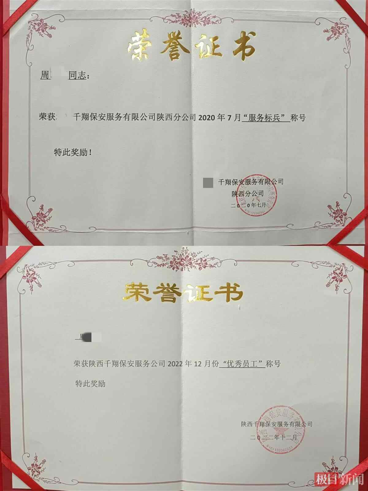 周女士向记者出示的资料显示,周某某在2022年7月、2022年12月,分别被千翔公司评为服务标兵、优秀员工。周某某曾以志愿者身份参与疫情防控工作,华远海蓝城社区于2022年给他颁发了荣誉证书。