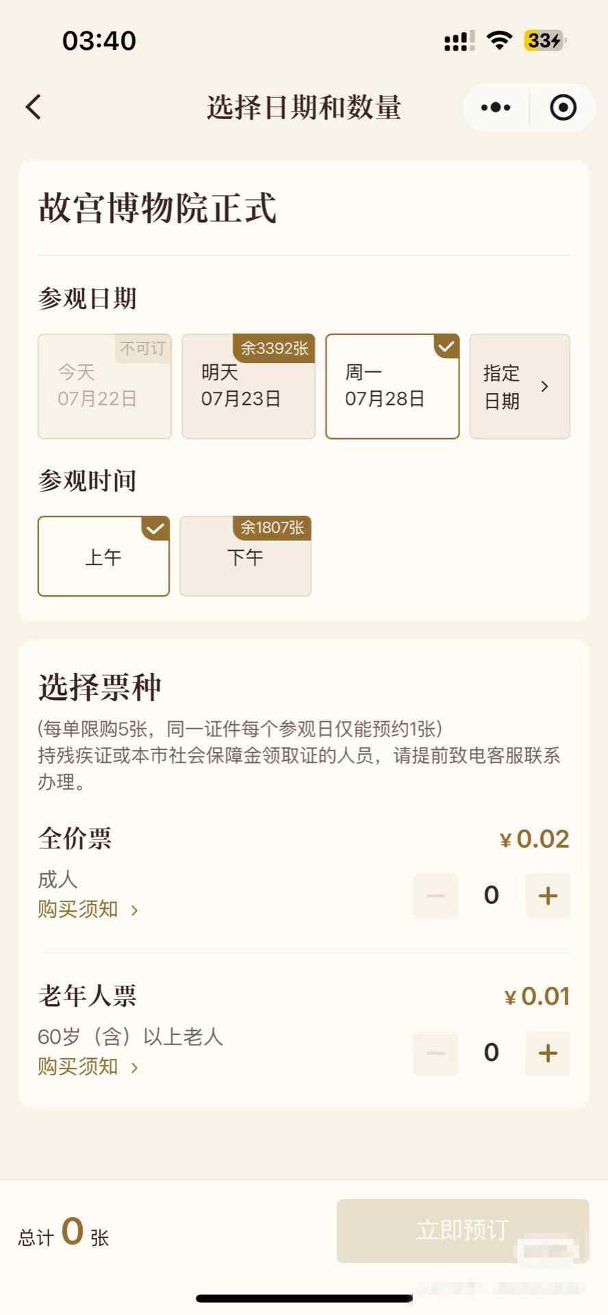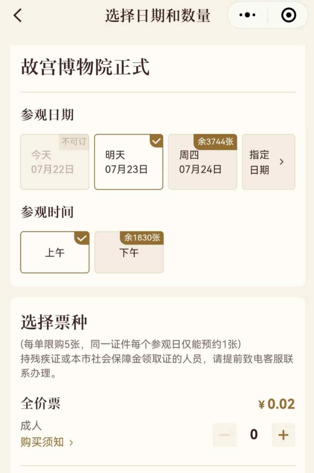 22日上午,故宫博物院回应,凌晨因购票小程序升级时出现异常,导致7月22日至7月28日的票额、票种、票价显示错误。目前,小程序功能已恢复正常。