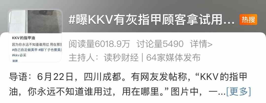 7月22日,#曝KKV有灰指甲顾客拿试用指甲油涂脚#冲上微博热搜,引发大众关注。据媒体报道,四川成都有网友发帖爆料,称KKV有灰指甲顾客拿试用指甲油涂脚,7月21日,涉事KKV门店工作人员表示,对于该帖内容,她会上传报备。