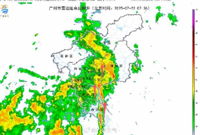 从雷达图来看,这一长条“列车”一直沿着同一个方向从珠江口北上,其经过的番禺石楼、南沙区南沙街晓港街更是在持续性降雨下发布了暴雨红色预警。