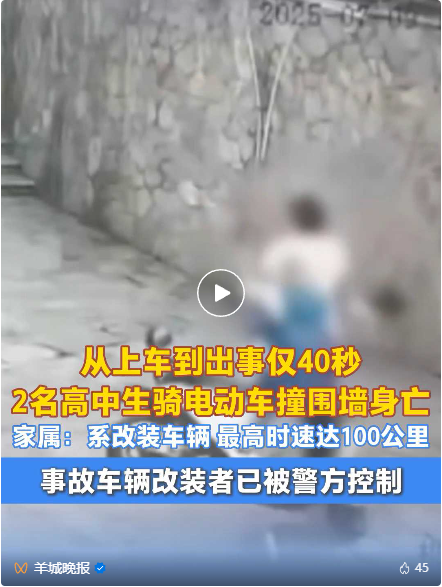 陶女士称,当天儿子同学的电动两轮车刚改装好,几个同学去试乘车,她儿子刚坐上车的后座40秒就发生事故,儿子被甩墙上当场身亡,骑车同学送医抢救无效死亡。记者从桃江交警大队获悉,事故车辆改装者已被警方控制,目前事故仍在调查处理中。
