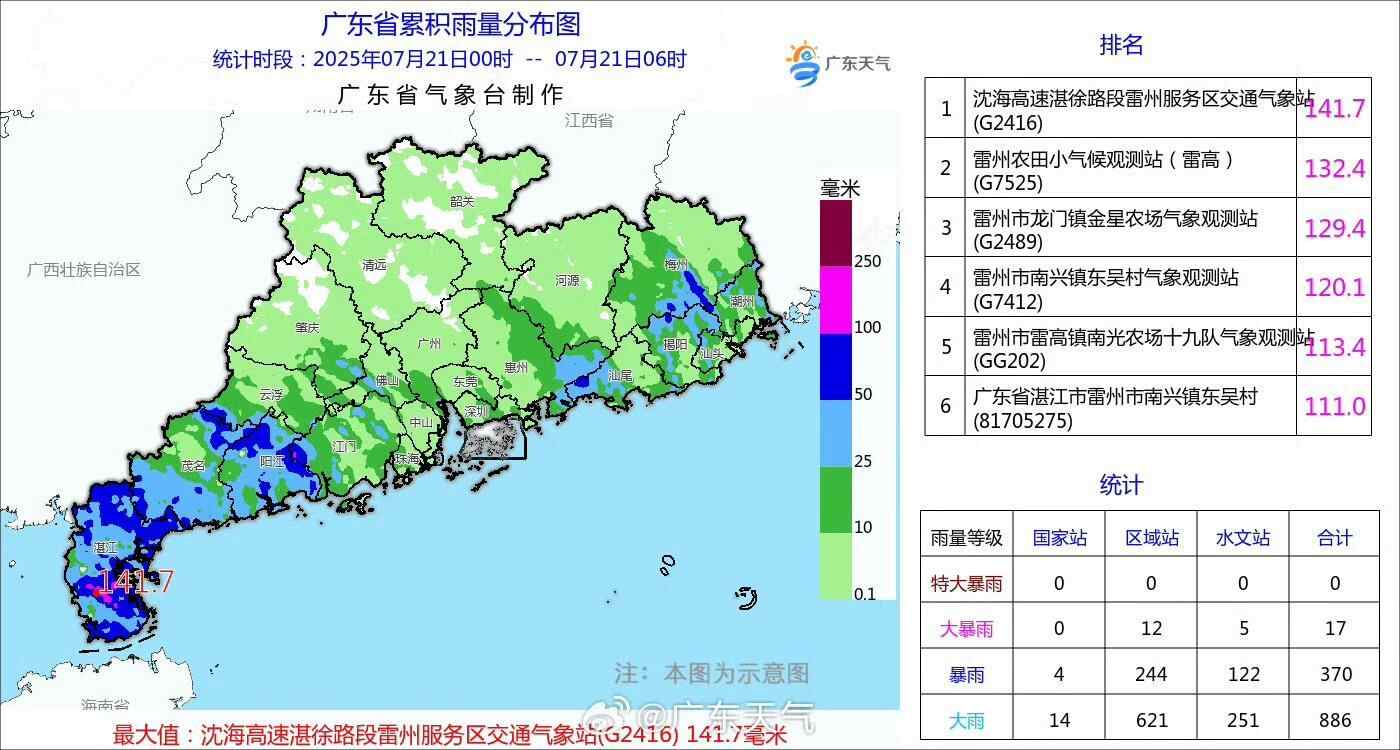 受台风“韦帕”影响,21日0时—6时,粤西湛江、茂名、阳江多地出现大雨到暴雨,局地大暴雨,其中广东省降雨量前五名均出现在湛江雷州。截至21日7时,湛江、茂名、阳江三市台风、雷雨大风和暴雨预警同时生效,其中湛江雷州、徐闻,阳江阳春、海陵经济实验开发区,茂名电白、信宜均为暴雨红色预警。