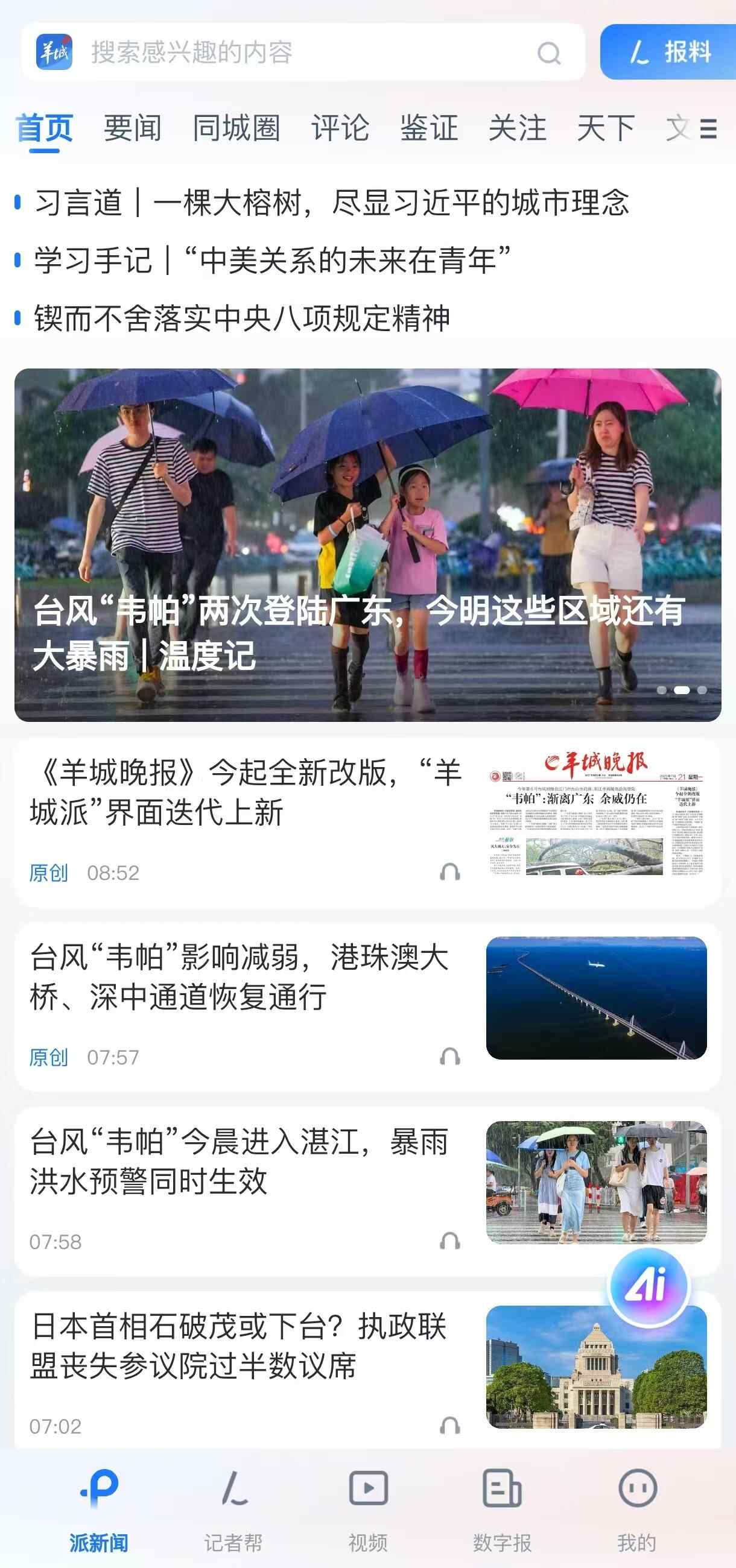同日,“羊城派”9.1版焕新登场。在今年6月24日“羊城派”9.0版全新亮相的基础上,“羊城派”的界面设计不断优化,9.1版更加突出清新美观、简约轻盈的特点:顶部导航和底部导航样式进行了全新升级,按钮替换为全新的icon(图标)设计,新闻列表标题图样式统一为16:9,二级页面重点优化了“记者帮”“视频”“我的”等底部板块。