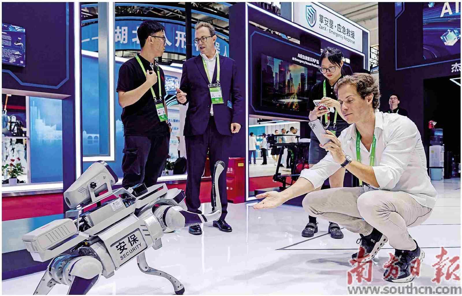 第三届链博会上,境外观众正在与广东企业的电磁网捕巡防机器狗互动。 钟志辉 摄