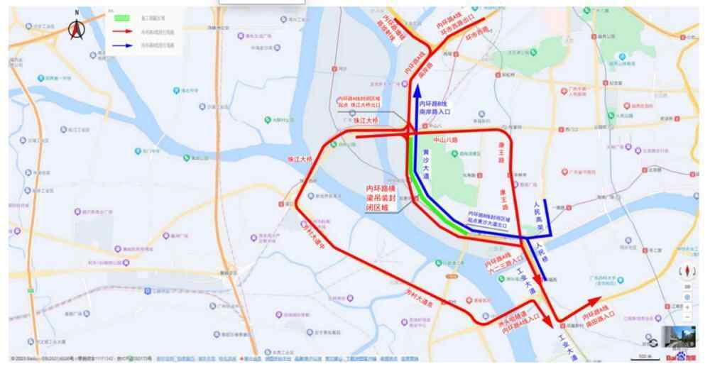 内环路A线车辆交通疏导:环市西路出口→南岸路→中山八路→康王路→内环路A线六二三路入口。