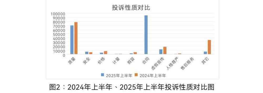 从投诉性质分析,2025年上半年售后服务、合同和质量三类性质投诉量较大,共268721件,占89.57%。涉及安全类投诉涨幅最明显,共有6056件,比去年增加1356件,上涨28.85%。