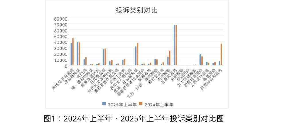 上半年商品类投诉133904件,占投诉总量44.63%。居商品类投诉前三位的是服装鞋帽类、家用电子电器类、和日用商品类,共101924件,占商品类总量76.12%。