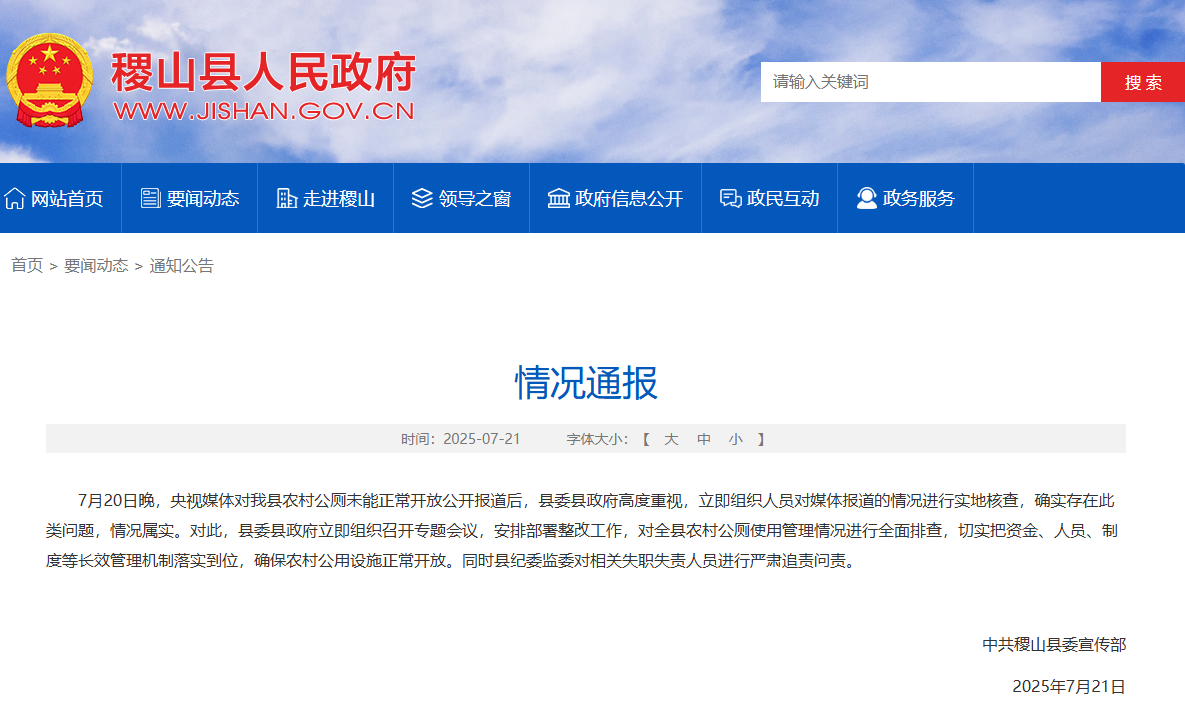 7月20日晚,央视媒体对我县农村公厕未能正常开放公开报道后,县委县政府高度重视,立即组织人员对媒体报道的情况进行实地核查,确实存在此类问题,情况属实。对此,县委县政府立即组织召开专题会议,安排部署整改工作,对全县农村公厕使用管理情况进行全面排查,切实把资金、人员、制度等长效管理机制落实到位,确保农村公用设施正常开放。同时县纪委监委对相关失职失责人员进行严肃追责问责。