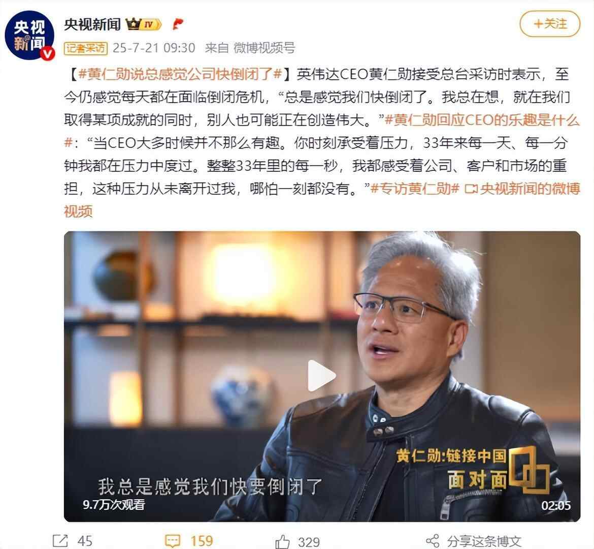 英伟达CEO黄仁勋接受总台采访时表示,至今仍感觉每天都在面临倒闭危机,“总是感觉我们快倒闭了。我总在想,就在我们取得某项成就的同时,别人也可能正在创造伟大。”