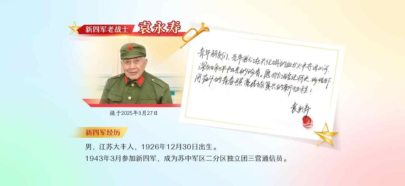 新四军经历:1944年加入新四军特务二团团部侦通排通信班,年仅15岁。在抗战期间,他穿梭于枪林弹雨中传递情报,多次与日军正面交锋,以“智勇双全”完成“使命必达”的任务。
