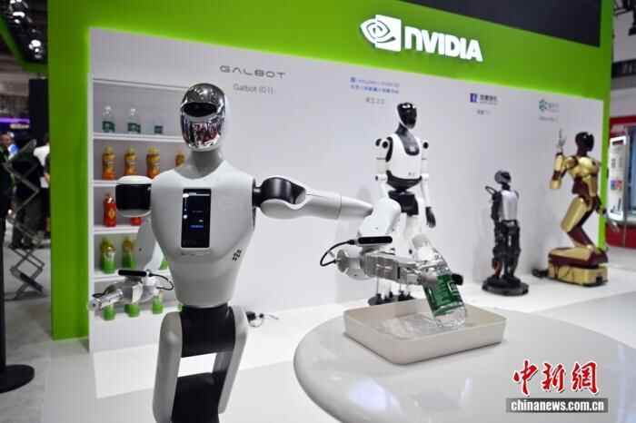 第三届链博会数字科技链展区的英伟达展台,人形机器人正在演示运送水瓶。