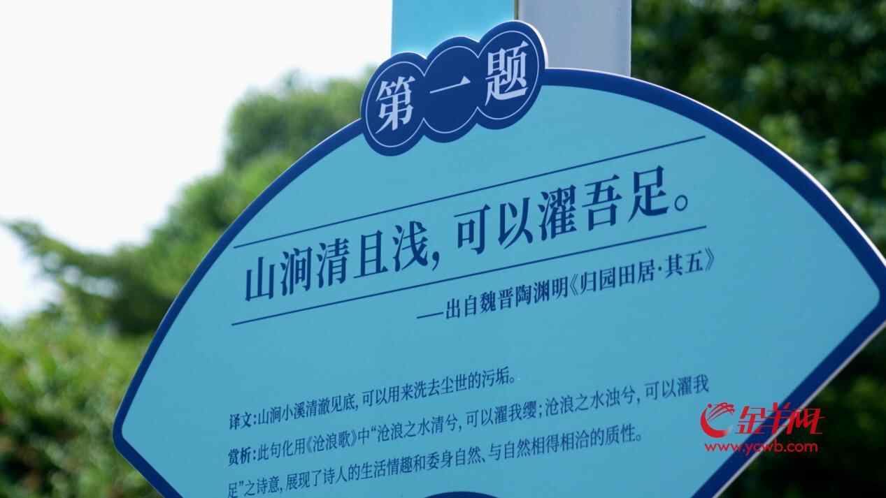 在公园的沿登山步道里,能看到诗歌赏析展板点缀在绿树旁、溪流边,在游玩中品味诗歌,别有一番风味。识别上面的二维码,还可以参与线上答题。