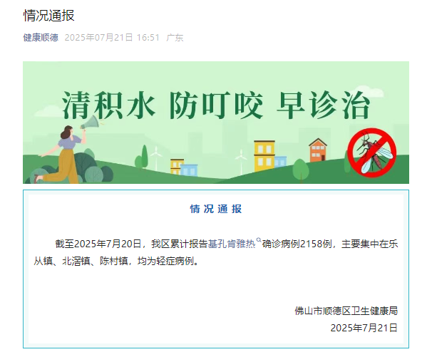 2025年7月21日,顺德区卫生健康局发布该区基孔肯雅热病例情况通报:截至2025年7月20日,该区累计报告基孔肯雅热确诊病例2158例,主要集中在乐从镇、北滘镇、陈村镇,均为轻症病例。