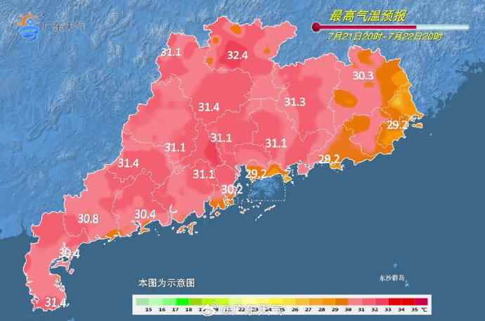 23日,南部沿海市县有中到大雨局部暴雨,其余市县有中(雷)阵雨,局部暴雨。最高气温:广东大部分市县介于31~34℃。