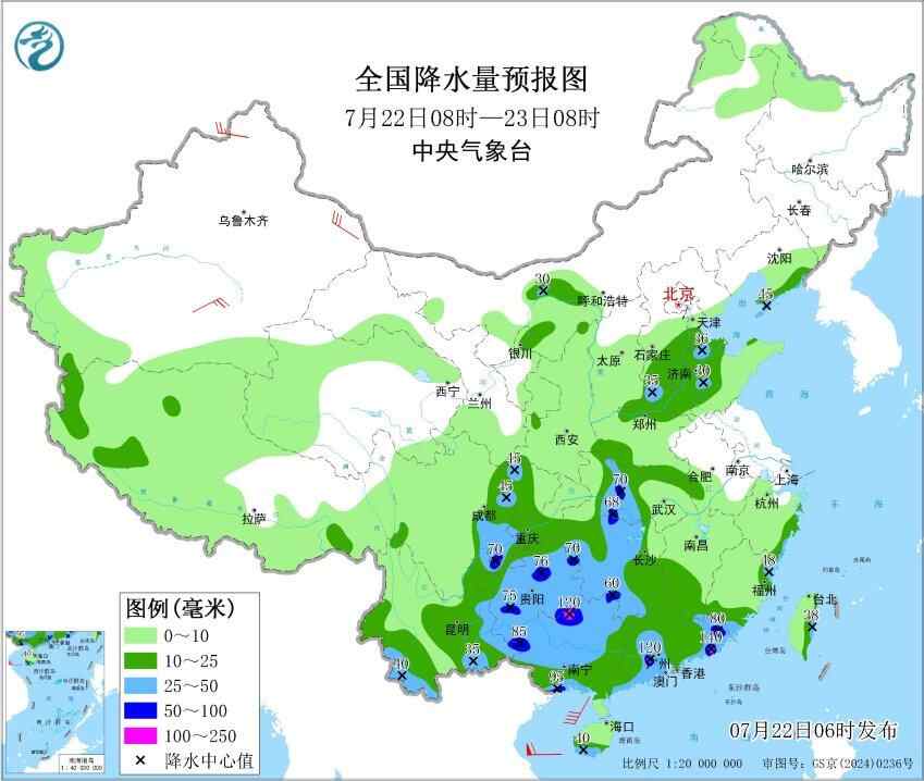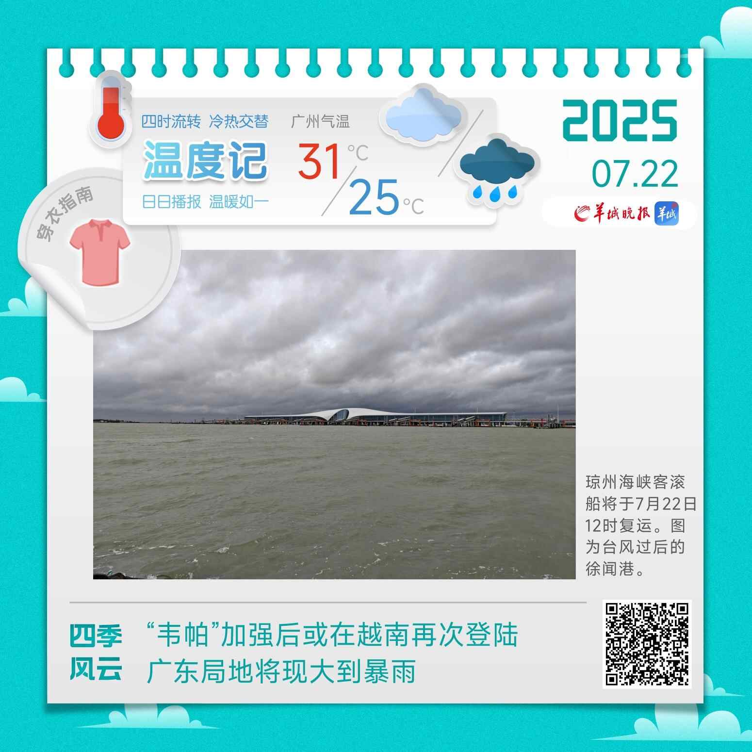 22日,珠三角南部和粤西有大雨局部暴雨,粤东市县中到大雨局部暴雨,其余市县有中(雷)阵雨,局部暴雨。最高气温:广东大部分市县介于29~33℃。