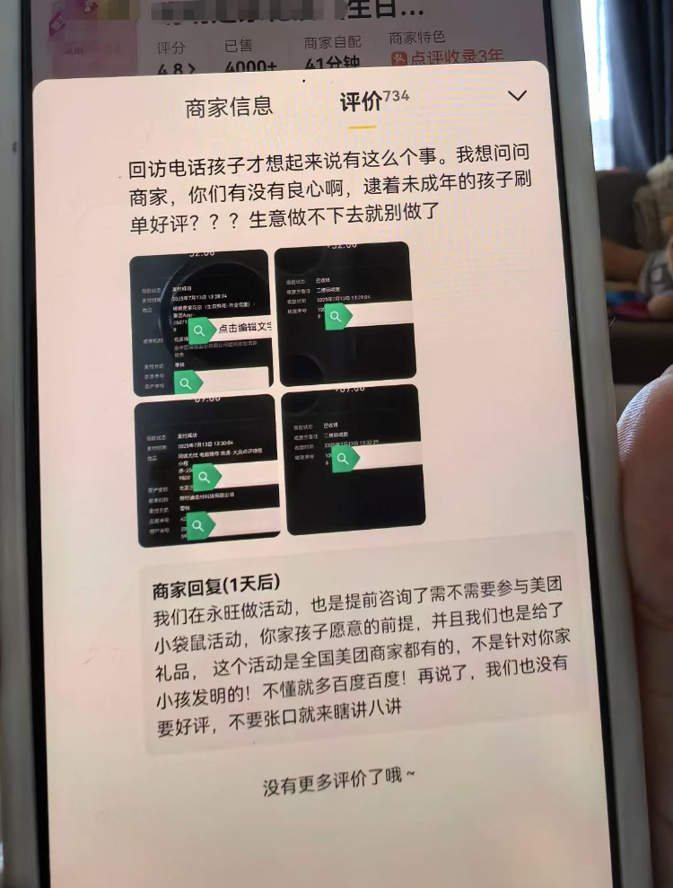 针对家长反映的事情,涉事花店负责人回应称,其雇佣的地推人员确实以扫码送礼的方式接触了两位学生。“但没有强迫,可能是地推人员比较热情,小朋友也很善良,是在小朋友同意的情况下完成操作的,我们也送了对方扇子。”该负责人强调,此行为并非刷单,而是参加美团的“小袋鼠”推广活动。“受饿了么、京东外卖大战影响,店里每天有10单的推广量,需要顾客在店铺内下单有小袋鼠标签的商品。”她解释,整个过程未收取孩子一分钱,后续也会叮嘱地推人员不再找未成年人,也不再操作对方的手机。