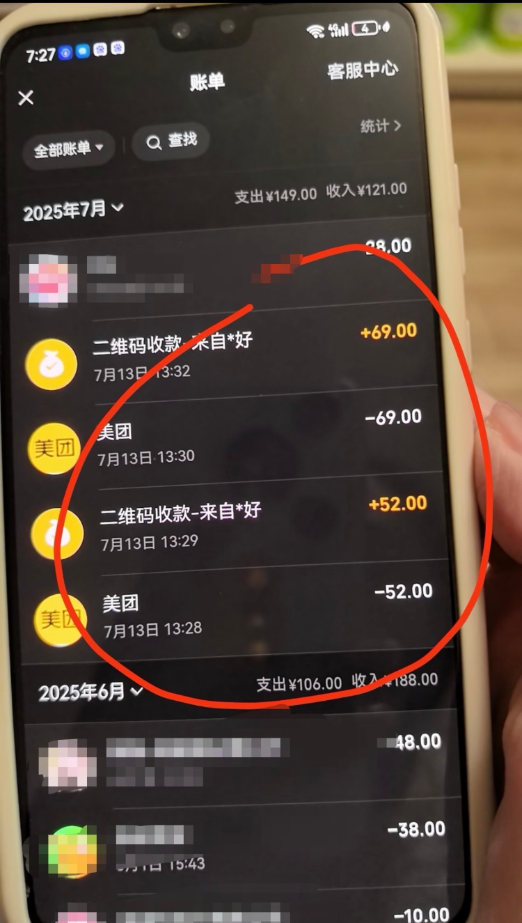 家长晒出的记录显示,7月13日的微信账单出现了两笔美团订单扣款,分别为52元和69元。随后的三分钟内,又分两笔返还了与订单相同的金额。