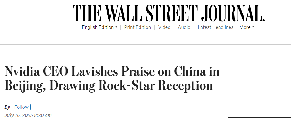 美国《华尔街日报》报道称,市值达4万亿美元的AI芯片公司掌门人黄仁勋在访问北京期间多次表达对中国的赞赏,盛赞中国的科技进步。