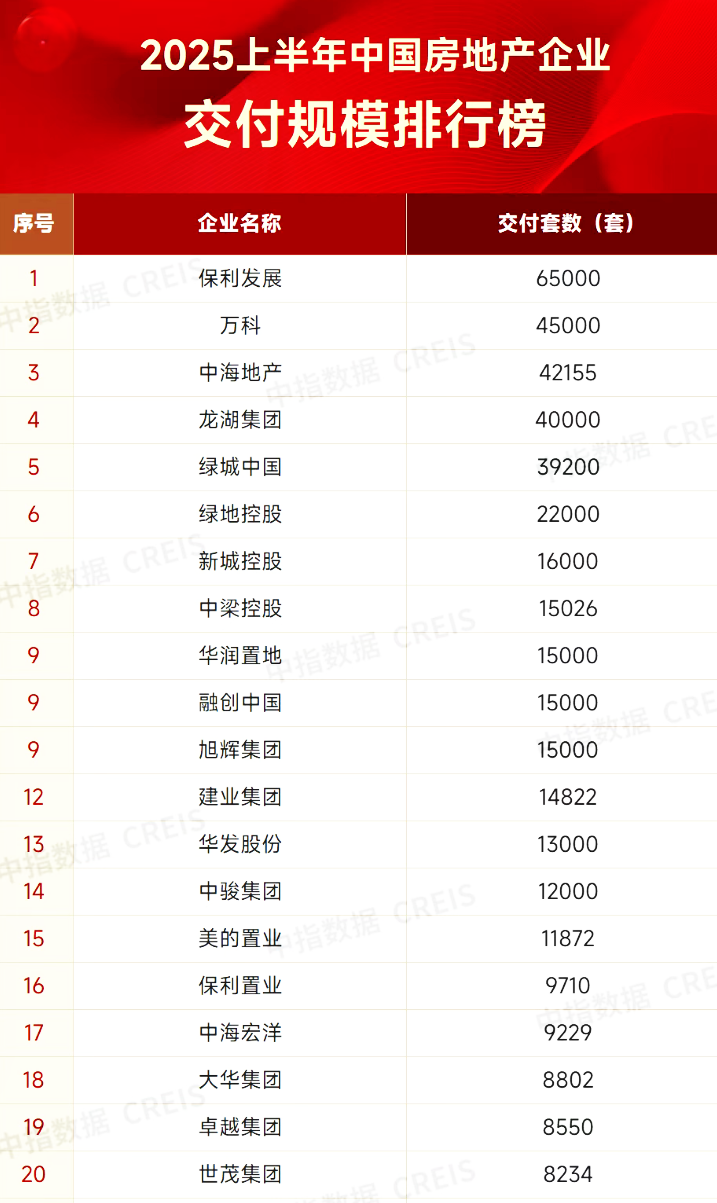 7月21日,中指院发布2025上半年中国房地产企业交付规模排行榜显示,保利发展、万科、中海地产和龙湖集团上半年均交付超过4万套房源。包括这四家在内,上半年一共有15家企业交付套数超万套。与去年同期相比,企业交付套数普遍下降,绿地、融创、建业等交付规模下降超50%。